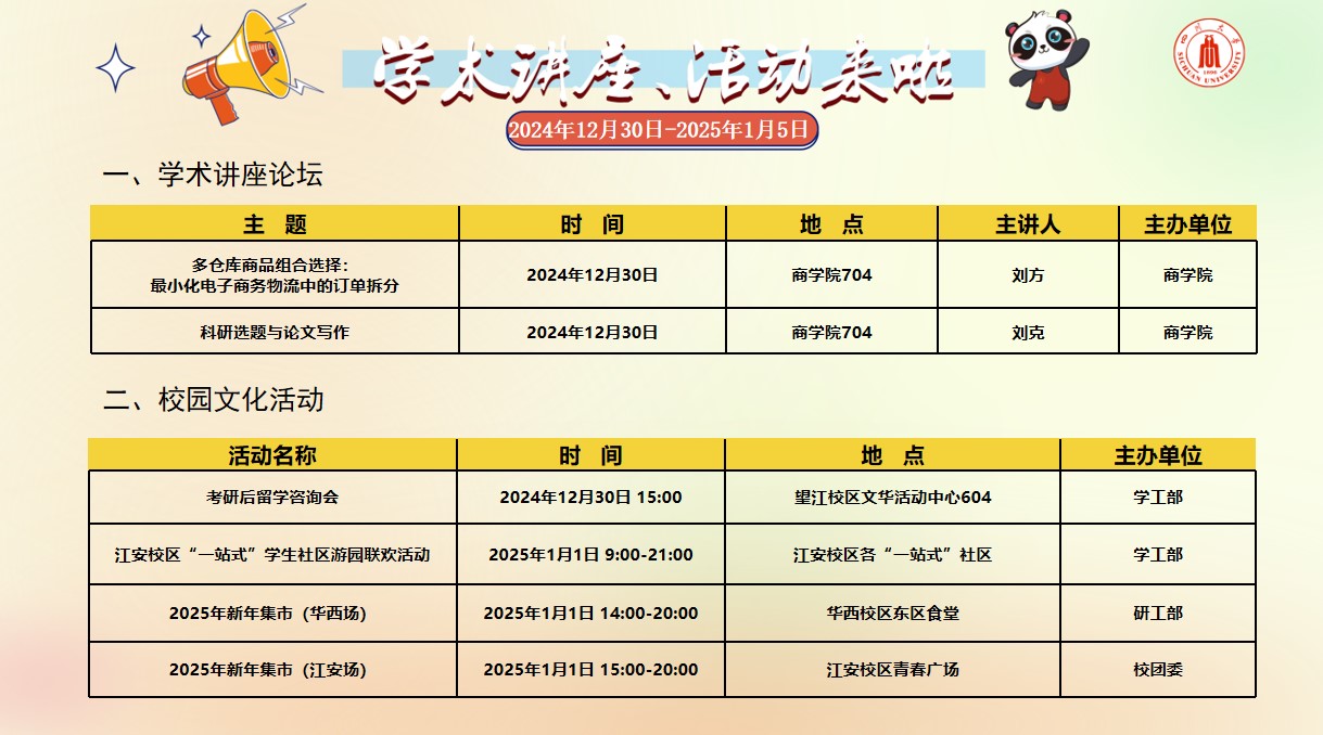 四川大学2024年12月30日-2025年1月5日讲座及校园文化预告