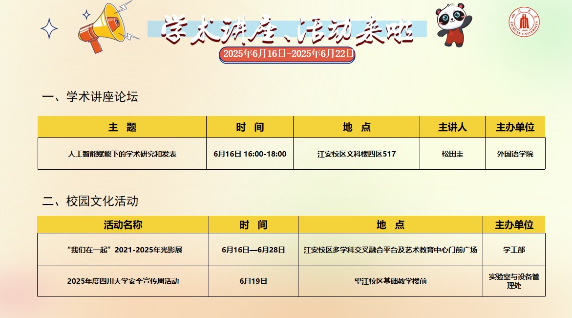 四川大学2025年6月16日-6月22日学术讲座论坛及校园文化活动预告