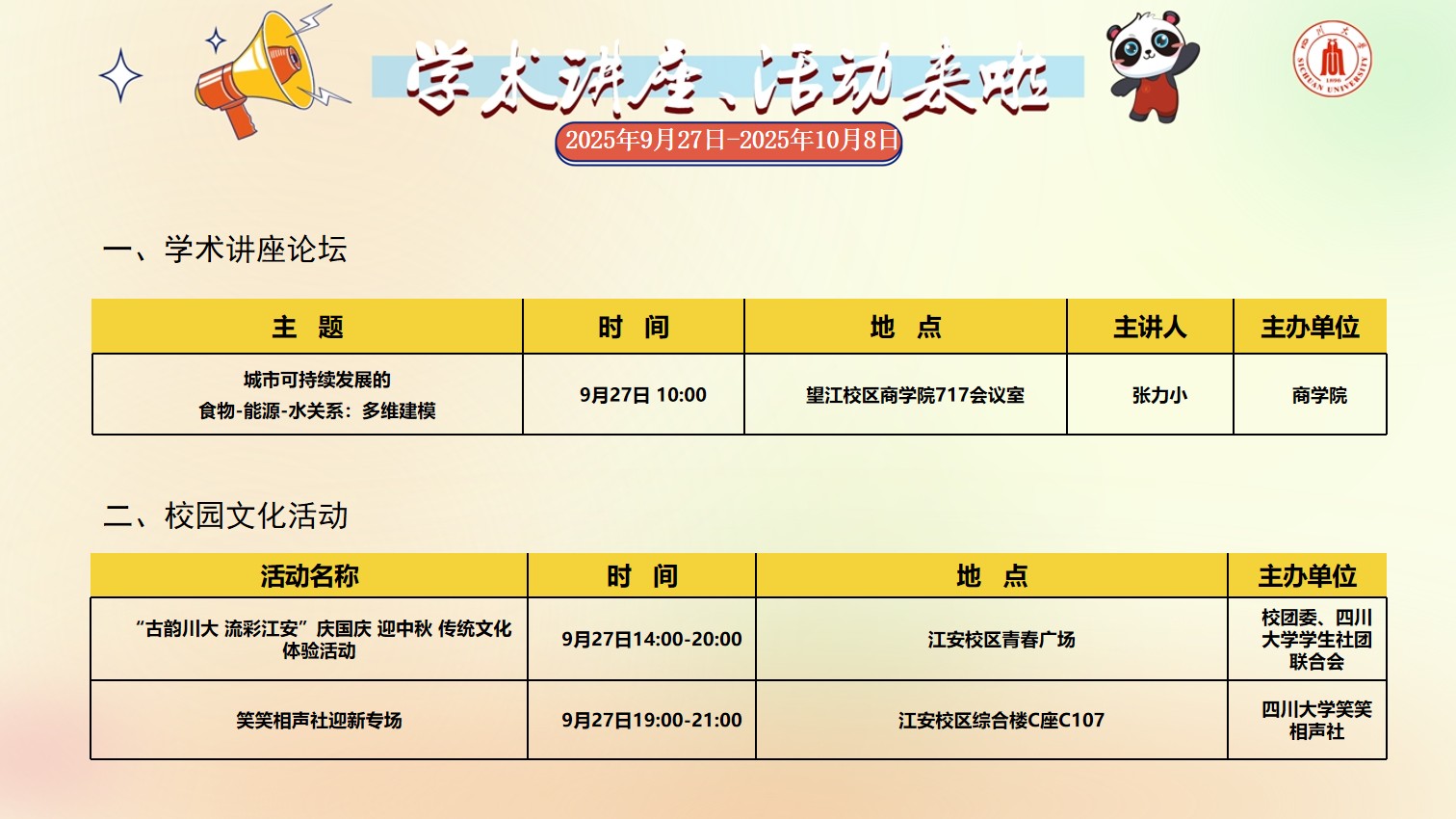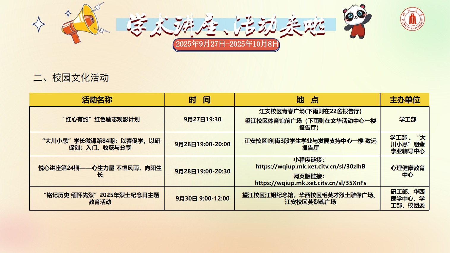 四川大学2025年9月27日-2025年10月8日校园文化活动预告
