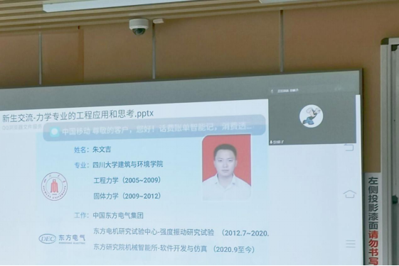 中国东方电气集团科学技术研究院高级工程师,2005级工程力学专业校友朱文吉分享了力学专业的工程应用和自己的一些思考。朱文吉先生为同学们送出了“系出名门,天生骄傲”、“力之所及,斡旋天地”、“年华易老,莫负青春”三条宝贵建议,并对三条建议进行了细致的解读,还向同学们提出了“见贤思齐焉”的真诚建议。