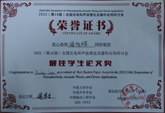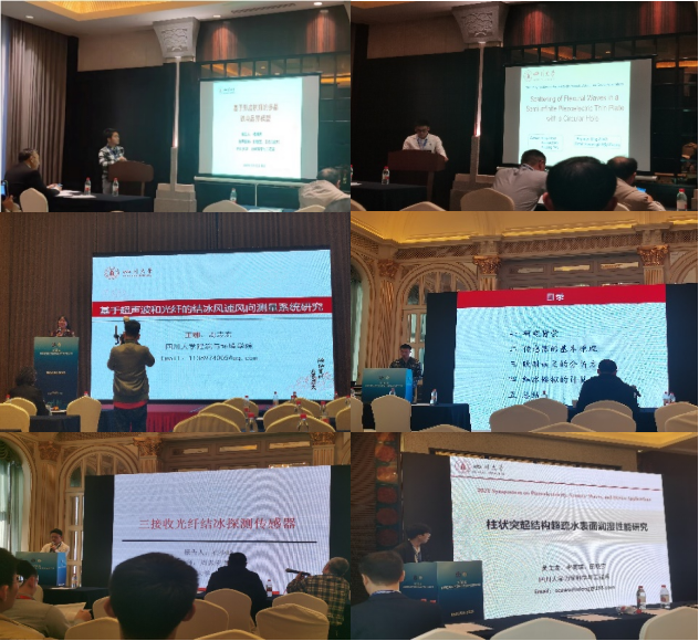 在多晶铁电晶界、压电弯曲波、压电表面润湿行为、结冰传感器以及结冰测量系统方面的最新研究成果。报告受到与会专家的高度肯定,其中硕士研究生楼旭辉同学获大会“最佳学生论文奖”(全国仅6个),是四川大学在此会议中首次获该奖项,并在会后获赵淳生院士赠书。