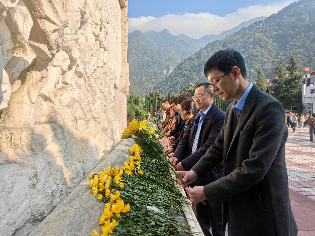 首先映入眼帘的是映秀镇的爱国主义教育基地,庞大的母亲雕像令人震撼不已,其身后飘扬的红旗更是让人心生肃静。在漩口中学祭奠广场前,戴峰院长带队进行祭拜仪式,全体师生手持菊花庄严肃立以纪念在与汶川大地震斗争中牺牲的烈士与难民。默哀完毕,师生有序上台在地震纪念碑下献花。