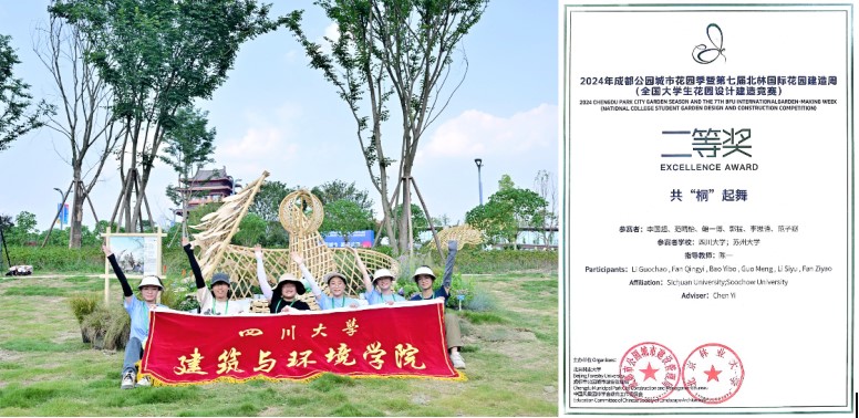 2024年成都公园城市花园季暨第七届北林国际花园建造周(全国大学生花园设计建造竞赛)作为2024成都世园会国际竞赛项目之一,紧紧围绕世园会办会理念,以特有的“竹构建造”,助力世园会,诠释公园城市。李国超、范晴怡、鲍一博、郭猛和建筑学李思语、范子窈的作品《共“桐”起舞》(指导教师:陈一)获得二等奖,该方案已在2024成都世园会实地建造并展示。