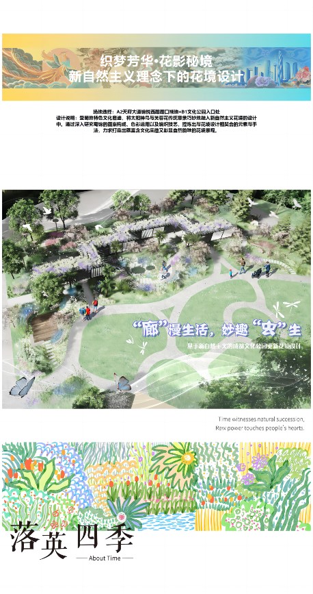 在第三届天艺杯微景观设计大赛——城市自然主义花境设计竞赛中,三支队伍分别斩获一等奖和三等奖。天艺杯微景观设计大赛是在企事业单位和四川省高校支持下的竞赛活动,以“城市自然主义花境”为主题,开展川花特色植物的创新性应用与景观植物多样性等方面的研究与探索,打造创意新颖、绿色低碳、节约持续的近自然花境。李国超、范晴怡、鲍一博、方恒卓、余建城的作品《织梦芳华·花影秘境》(指导教师:陈一、罗言云)获得一等奖;周心悦、贾适夷、胡淼、李欣悦的作品《“廊”漫生活,妙趣“虫”生》(指导教师:王霞)以及周韵妮、何瑞、潘桂林的作品《落英四季》(指导教师:王倩娜)获得三等奖。