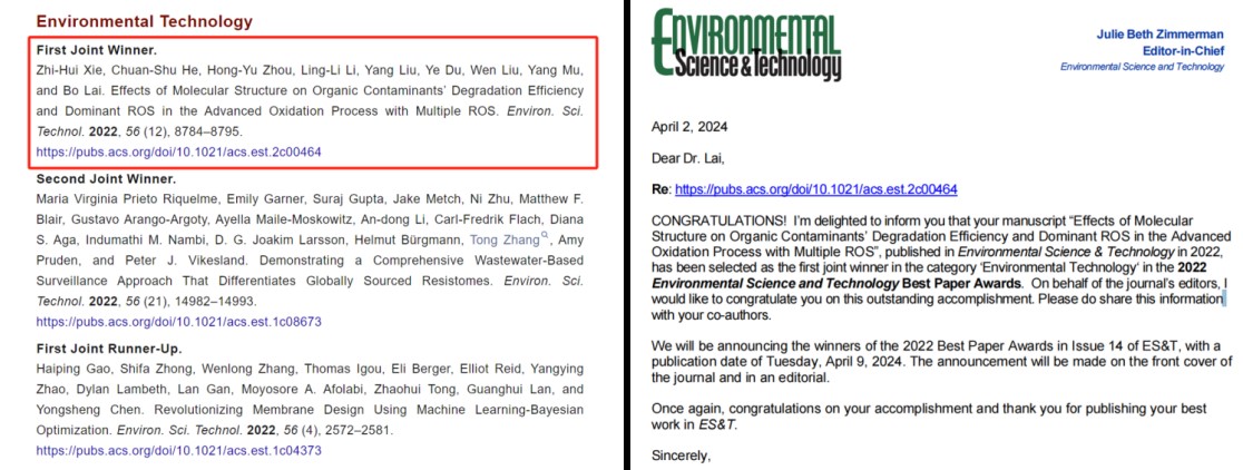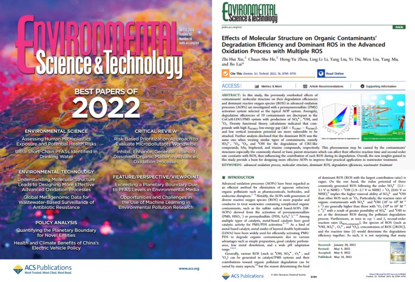 环境系博士研究生谢智慧,何传书教授为第一作者,赖波教授为通讯作者的研究论文“Effects of Molecular Structure on Organic Contaminants Degradation Efficiency and Dominant Reactive Oxygen Species (ROS) in Advanced Oxidation Process with Multiple ROS”荣获2022年度ES&T最佳论文奖,在环境技术类(Environmental Technology)文章中排名第一(First Joint Winner)。