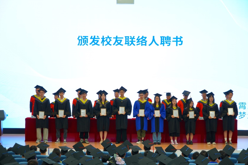 学院院长戴峰宣读四川省教育厅关于表彰2024届四川省优秀大学毕业生的文件和学院设立学�2024届校友联络人的决定。华国春、戴峰共同为学院获奖同学颁奖,出席典礼的领导、老师�2024届校友联络人颁发聘书�