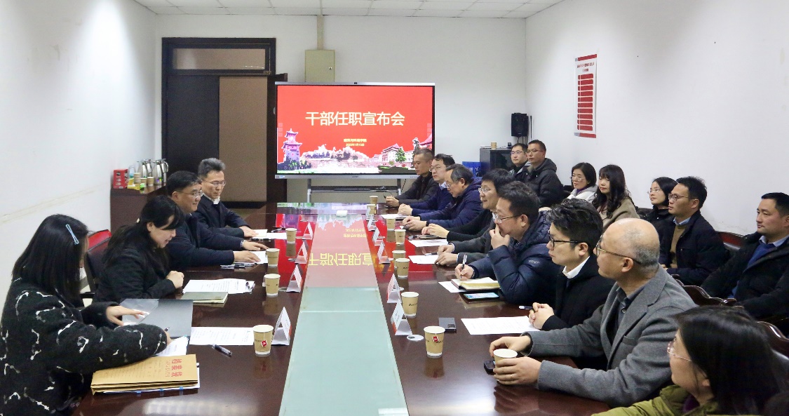 班子成员、学术院长、工会主席、两委委员、专职组织员、院长助理、系主任、教工支部书记、科级干部参加宣布会。