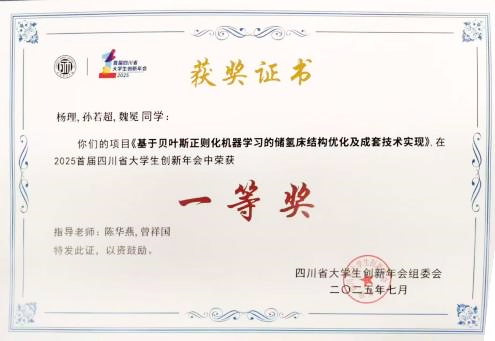 学子表现优异,由力学科学与工程系陈华燕老师/曾祥国教授指导、工程力学专业“强基计划”学生杨理负责的项目《基于贝叶斯正则化机器学习的储氢床结构优化及成套技术实现》,由环境科学与工程系杜烨副教授指导,环境工程专业学生王俊杰负责的《微波释电无极紫外线/臭氧联用工艺对再生水的消毒效果及机制研究》分别斩获一等奖(全校共8项)。