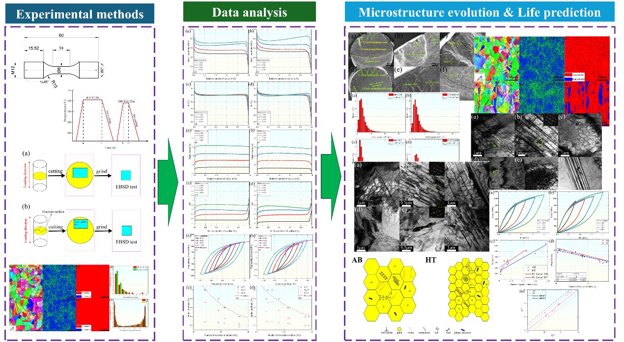 12Cr18Ni9 钢是一种奥氏体钢,因其出色的耐腐蚀性和机械强度而被广泛应用于弹簧、紧固件和汽车部件等领域,能在较宽的温度范围内保持良好的机械性能,加上出色的成型性和焊接性,是一种理想的工程材料。然而,12Cr18Ni9 钢经常面临重复应力挑战,尤其在弹簧等承受循环载荷部件中,因而低周疲劳(LCF)成为影响其性能和寿命的关键因素。为满足工业领域要求,在室温(RT)条件下,对坯件(AB)和热处理后的铸件(HT)进行低周疲劳(LCF)试验,再使用扫描电子显微镜 (SEM) 和电子背散射衍射 (EBSD)、透射电子显微镜 (TEM)分析 LCF 后的微观结构演变和失效机制。通过以上操作发现,热处理显著细化12Cr18Ni9钢晶粒,使其在高应变幅(1.0%)下增强循环硬化并延长疲劳寿命;微观机制表明该优化源于位错密度降低与晶粒细化在高应变下诱发的马氏体转变,从而稳定寿命并强化硬化效果。本研究成果还建立了坯件(AB)与热处理件(HT)的疲劳寿命能量预测模型。