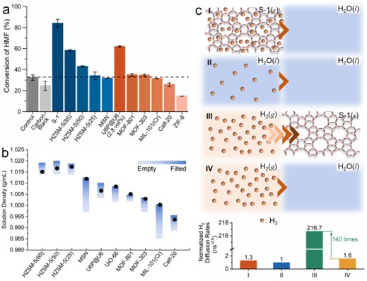文章设计了一种具有疏水内核和亲水外壳的核-壳结构MOF材料U6P@U6,其在水相中能保持永久孔隙性,作为“气体穿梭体”在气-液界面吸附氢气,并通过对流将其输送至催化剂表面,从而显著加速氢气的传质过程。在羟甲基糠醛(HMF)氢化反应中,仅添加3.7 wt%的U6P@U6,即可在温和条件下实现350%的反应速率提升,且可支持六倍催化剂用量而不受传质限制。机理研究表明,该增强效应主要源于氢气在MOF颗粒中的扩散速率比在水中提高了140倍。该策略不仅为解决三相反应中的气体传质瓶颈提供了通用思路,也为开发高效、低成本的多相催化系统开辟了新路径。研究制备MOF颗粒所用的关键载体材料S-1沸石由楚英豪教授团队在四川大学实验室自主合成,其在催化分解含氯有机污染物方面也显示出优异的特性。