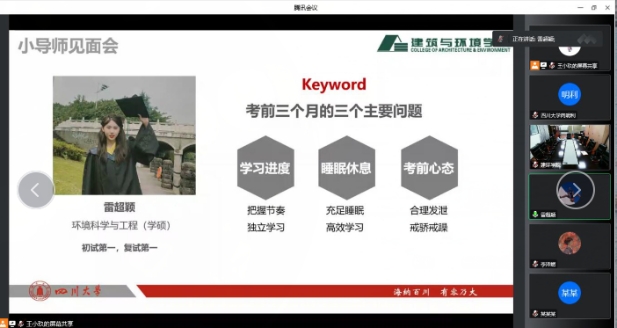 特色性的传承帮扶活动,将聘请往届优秀研究生作为研究生小导师,与考研学子结对,提供指导,为其在考研冲刺阶段“保驾护航”,助力成功上岸。“护航计划”小导师见面会上,研究生胡健林、雷超颖、郭焱桃3位小导师作为代表进行经验分享,根据自身真实的考研经历,从不同的角度交流考研期间的关键因素和可能遇到的阻碍及解决方案,并鼓励大家调整好心态,劳逸结合、高效学习。
