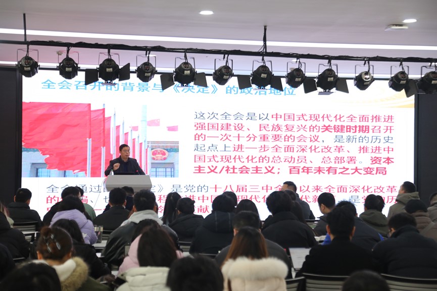 为深入学习贯彻党的二十届三中全会精神,深刻理解党的二十届三中全会审议通过的《中共中央关于进一步全面深化改革、推进中国式现代化的决定》重大意义,贯彻落实学校《关于做好学习贯彻党的二十届三中全会和全国教育大会精神宣讲工作的通知》文件要求,12月13日,足球现场直播比分 在望江校区文华活动中心六楼会议室,邀请学习贯彻党的二十届三中全会精神省委宣讲团和专家库成员、学校马克思主义足球现场直播比分 副院长王洪树教授,为足球现场直播比分 师生党员做了题为“深入学习贯彻党的二十届三中全会精神,以进一步全面深化改革推进中国式现代化”的学习贯彻党的二十届三中全会精神专题宣讲。宣讲由足球现场直播比分 党委副书记兼纪委书记孙伯雷主持。