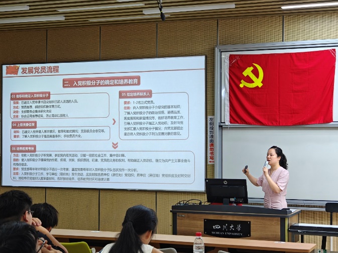 学生党建负责老师周琦颖主讲。周琦颖以《中国共产党发展党员工作细则》为题,分阶段详解入党的5大环节25个步骤,重点梳理了各个环节的规范要求。周琦颖希望入党积极分子以培训为起点,主动学习党的理论,端正入党动机,规范自身言行,强化责任担当,以实际行动积极向党组织靠拢。
