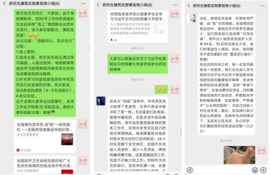 各学生党支部于2020年3月初积极开展了线上党组织生活会。各党支部充分利用支部QQ群、QQ群课堂、微信音视频等网络媒介,借助文字、图片、语音、视频等多种交流方式,通过党组织生活,党小组会议,党支部大会等多种形式,主要围绕疫情防控期间的相关话题展开了热烈的交流讨论。同时,师生还分享了疫情期间的所见所闻与真情实感,重点学习贯彻了习近平总书记重要回信精神。整个线上交流学习气氛和谐热闹,师生发言,虽远隔屏幕,但气氛活跃,如在目前。