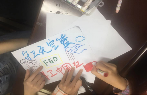 第三小组则结合环境专业,通过手绘水彩画,以“守卫天空蓝,捍卫中国红”为主题描绘出一幅碧水蓝天的景色,表达了习近平新时代“绿水青山就是金山银山”的先进理念,同时大家励志将自己所学应用到祖国实际建设中去,努力为祖国天更蓝、水更清做出自己的贡献。