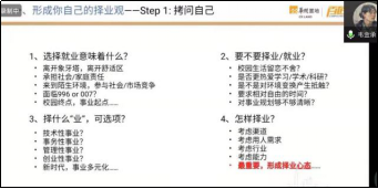 作为今年唯一的到高校工作的硕士研究生,风景园林专业预备党员郭仲薇毫无保留地分享了自己收集的可供硕士毕业生选择的高校职位类型、招聘渠道、以及针对性简历投递、高校面试等干货。被同学们誉�“地产offer收割机”的黄秋源详细分析了群面、结构面、专业面和终面四个面试环节遇到的挑战和应对策略,在线同学无不叹服。建筑学专业的韦金承从“选择”切入,讲述了如何确立择业观、如何衡量公司岗位与自身匹配度等心路历程。随后的问答环节中,同学们踊跃提问,嘉宾们耐心作答,线上会议室气氛热烈�