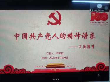 历史川流不息,精神代代相传�1949年,新中国成立,但是由于长期的战乱,新中国成立之初即面临着复杂严峻的国内外形势。社会主义革命和建设时期中国共产党人的精神由此诞生�20211126日,学院2018级本科党支部于开展以“社会主义革命和建设时期中国共产党精神谱系阐释”为主题微党课。支部全体党员参与学习�