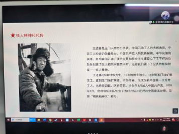王熠泽以王进喜相关小视频开场,结合王进喜的生平诠释了铁人精神的内涵,即“为国分忧、为中华民族争气”的爱国主义精神、为了革命“有条件要上,没条件创造条件也要上”的无私奋斗精神、“宁肯少活二十年,拼了命也要取得大油田”的无我拼搏精神、“要为油田负责一辈子”的求真务实精神。他指出铁人精神是我们凝心聚力,推动社会主义事业发展的不竭动力。研究铁人精神,继续挖掘铁人精神的丰富内涵,有助于培育更多创造时代伟业的新力�!
