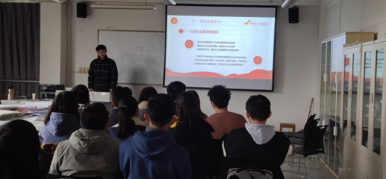 柴志卓和路翔仪同学带领大家回顾了讲话的部分内容,重温了振奋人心的视频片段。柴志卓同学围绕讲话,结合重要历史事件,向同学们分享了自己的理解和感悟。董子豪同学谈到,正是一代代共产党人的奋斗,让我们的国家迅速地发展了起来。讲话不仅仅是针对党员或者领导人,对我们广大学生都有着极大的激励作用。