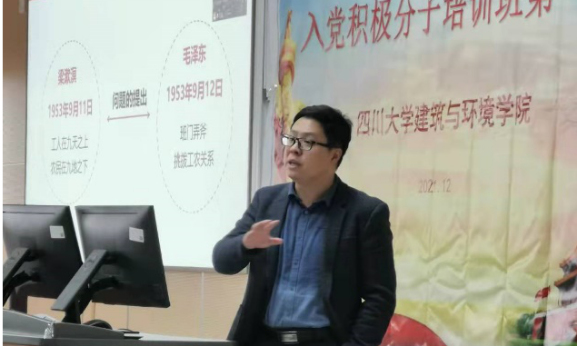为深入贯彻学习党的十九届六中全会精神,强化足球现场直播比分 入党积极分子教育,为党组织吸收新党员培养优秀后备军。123日,我院入党积极分子培训班第一期第一讲在江安综合楼C404教室顺利开展,学校“党史学习教育宣讲团”专家、马克思主义足球现场直播比分 付志刚副教授为同学们讲授题为“大历史观视野下中国共产党百年历史成就与经验”的专题党课。足球现场直播比分 辅导员王天泽、刘芸及全体积极分子参与此次培训